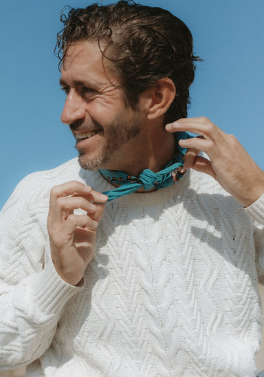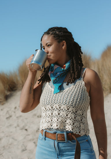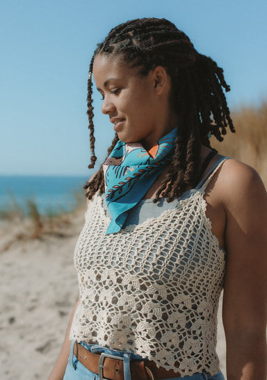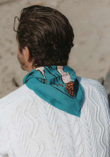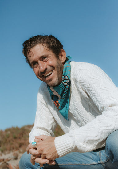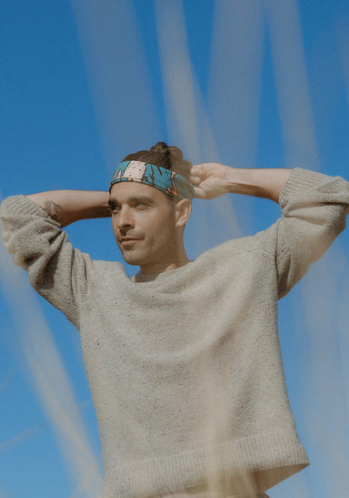 Fahrenno's bandana depicts his favorite coastal location on his island of Yogyakarta in Indonesia. The image in the design replicates (and inverts) the view from Parangtritis Beach, looking toward Merapi Mountain - an active volcano. The beach itself is steeped in local mythology, and is said to be a place to meet the legendary Nyai Loro Kidul or "Queen of the Southern Sea."