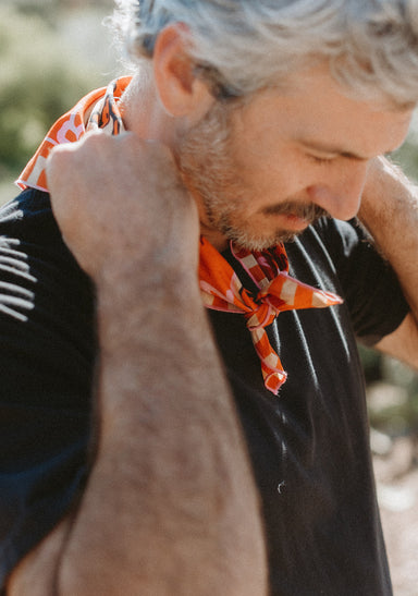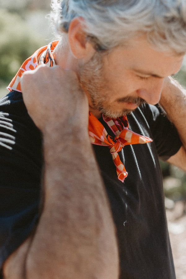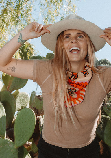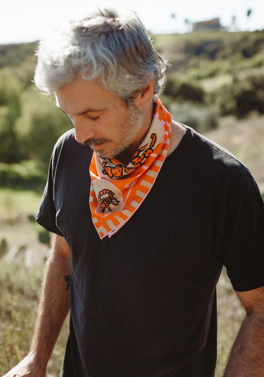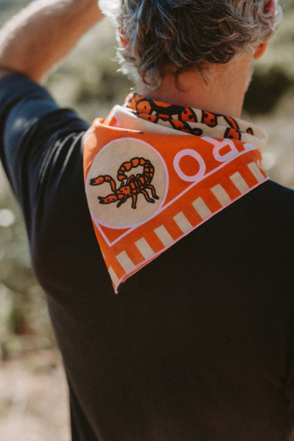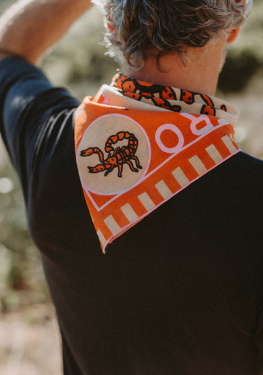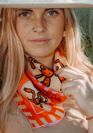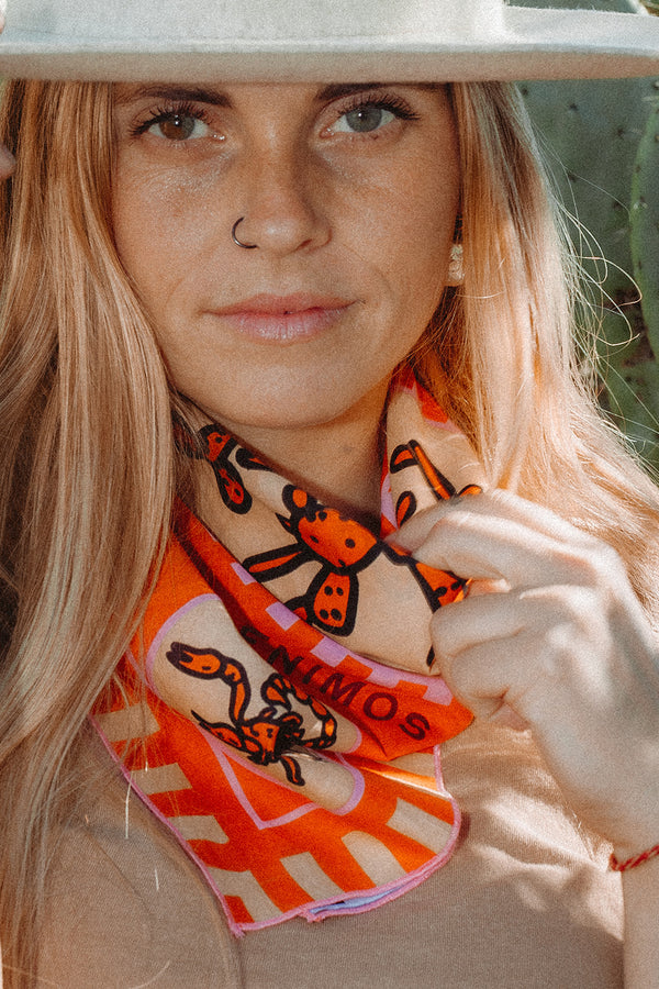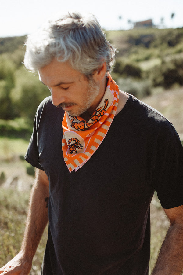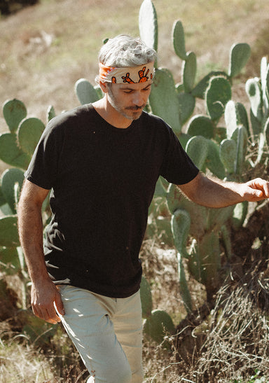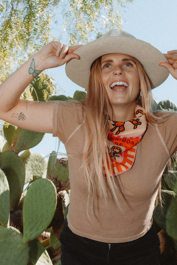 Seeing her parents struggle with the language barrier and dealing with the daily micro-aggressions from peers made her feel embarrassed by and disconnected from the ancestral history of family. It wasn't, she told us, until she left for art school in San Francisco, that she was exposed to a diversity far beyond what she had ever experienced in Texas. As she saw the world from different perspectives and learned more about America's complicated history, it led her to dive deeper into an appreciation for her own Mexican and Latin American lineage, the exploration of which shapes much of her work to this day. Paloma's bandana design uses the Nopal as a central connection to her ancestral heritage, paying homage to her family, the natural landscape, and the ancient beauty of the Mexican culture through images and words printed in each corner forming the sentence "Venimos De, De America Latina, De Gente Bonita, Hasta La Raiz" or "We come from, from Latin America, from beautiful people, to the roots."