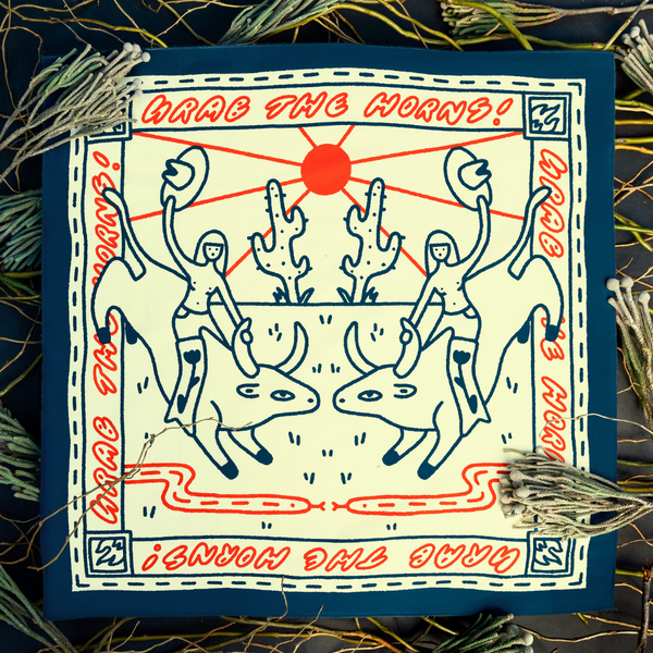 For her "Creature Collection" design, Holly leaned into her trademark irreverent style while paying tribute to the western motifs often associated with bandanas. As she explained, "I always love a tongue and cheek double meaning in my artwork, and this one just seemed to be a perfect example of 'grabbing life by the horns.' Just get on the damn bull and try not to fall off!"