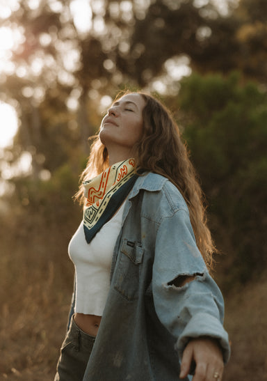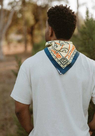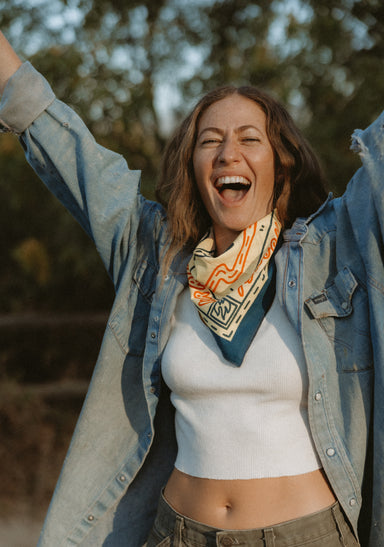Holly told us that much of her recent work has been influenced by road trips through the U.S. - think deserts, cowgirls, vegas lights etc. In that vein, the reverence for the larger than life stars of the rodeo seem a natural fit for a bandana design. Like the open road that inspired it, Holly's bandana design encourages freedom, courage, and adventure. Life can throw you around sometimes, so you might as well enjoy the ride.