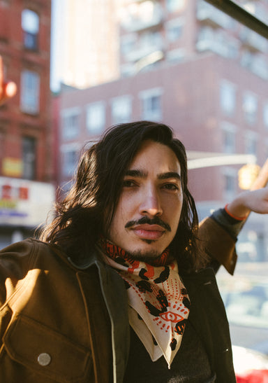 In “Concrete Jungle,” Rosa distills everything she loves about these places into a bandana unlike any we’ve featured before. The design leaps off the fabric with feline power and personal expression, true to Rosa’s signature tattoo work. It simultaneously exudes the busy, tough, walking-with-confidence attitude of the City, while playfully weaving in the fun, funky, laid-back energy of the outdoor spaces she loves.