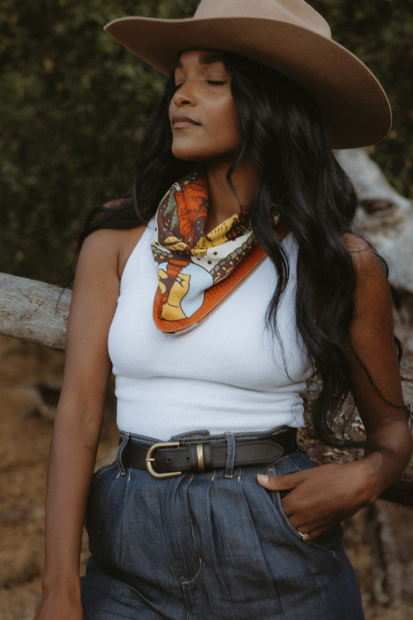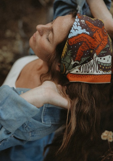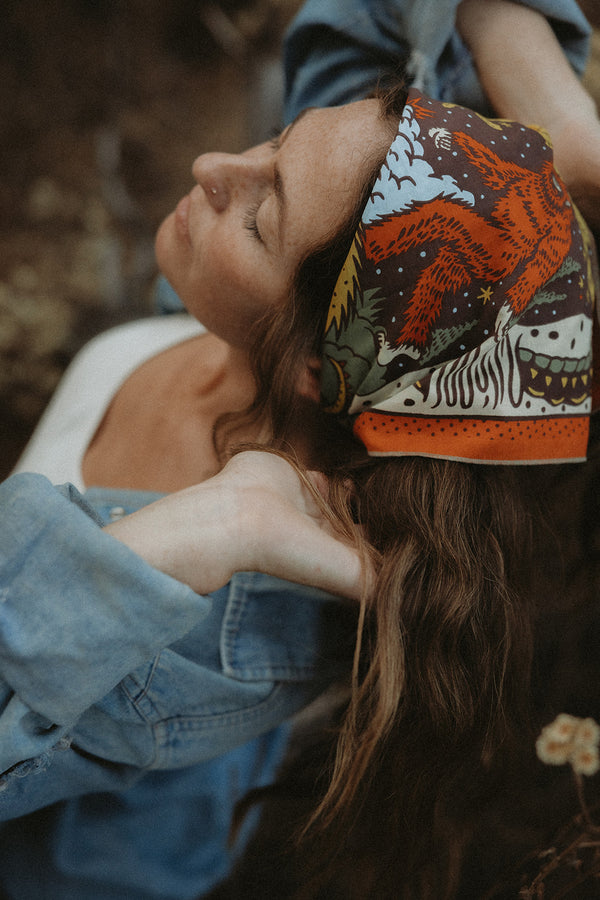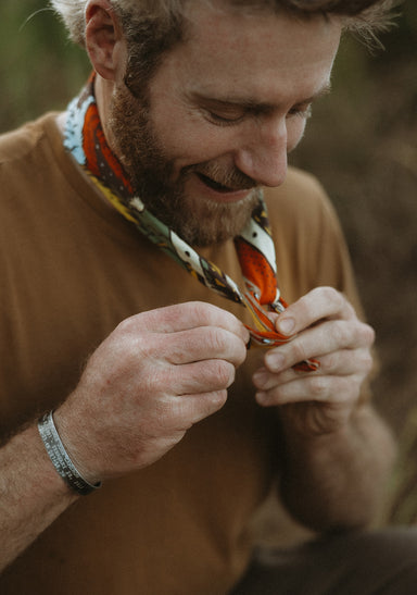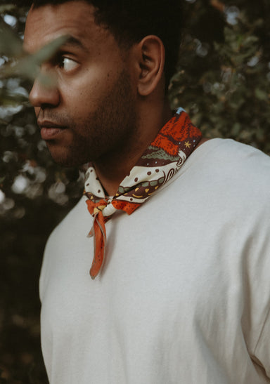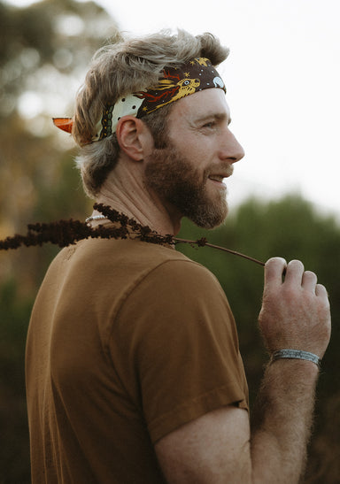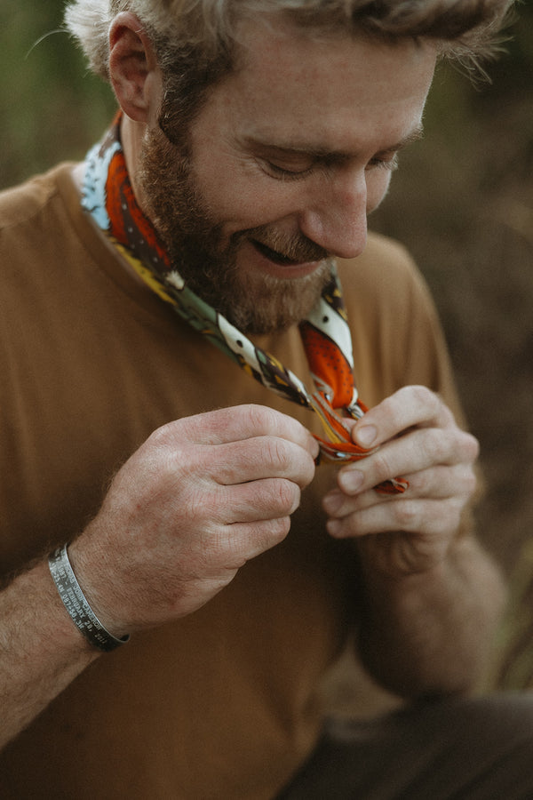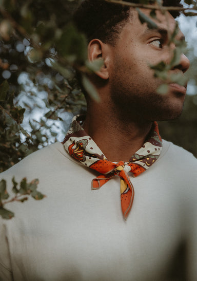 Nicolás Crespo is an graphic designer and illustrator based in Medellin, Colombia. His colorful creations have graced album covers, packaging, and branding for customer across the world. His signature style is characterized by a blend of bold color, vintage aesthetic, and a sprinkling of light-hearted fun that makes his designs sine with festive energy. When we asked Nicolás about his artistic influences, he told us, " I've had different periods where different things have permeated my work quite strongly, but I think what has lingered the most over the years are old memories of motorbikes, old American camp badges, old matchboxes, the nature around me and the deserts of the United States, which is my favorite landscape in the world." He also cited as influences many of the artists who've created bandanas for BANDITS - Brett Stenson, Joshua Noom, Alana Louise, Zaine Vaun, Brothers Design Co., and Land & She. We've been fans of Nicolás' work for a while and we're so excited to finally work with him on this incredible bandana design.