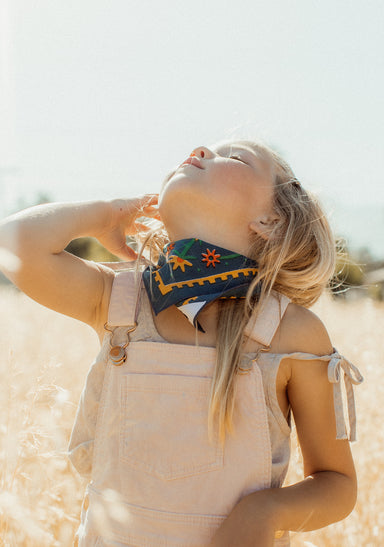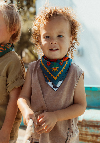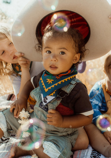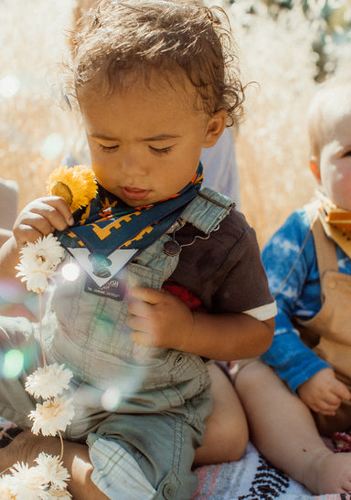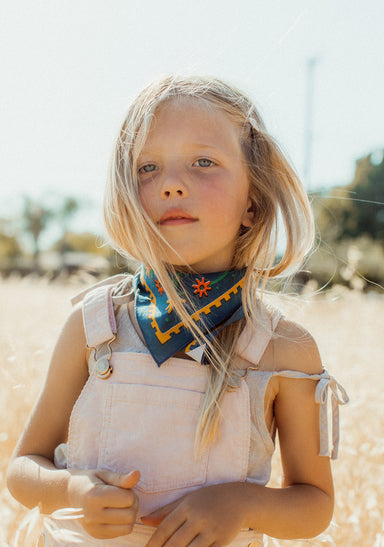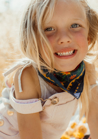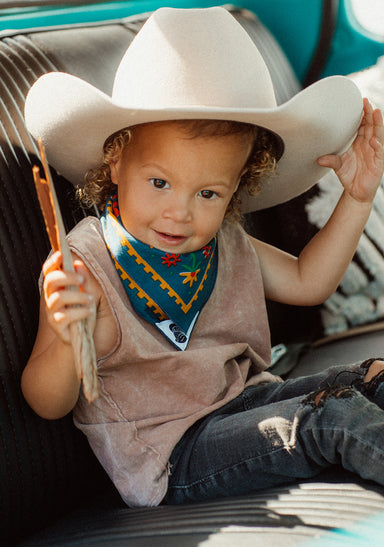 Smaller-sized 14 x 14 inch bandana. Can be worn on babies 6 months old - 6 years old. Machine wash cold with like colors, line or tumble dry, warm iron, do not bleach